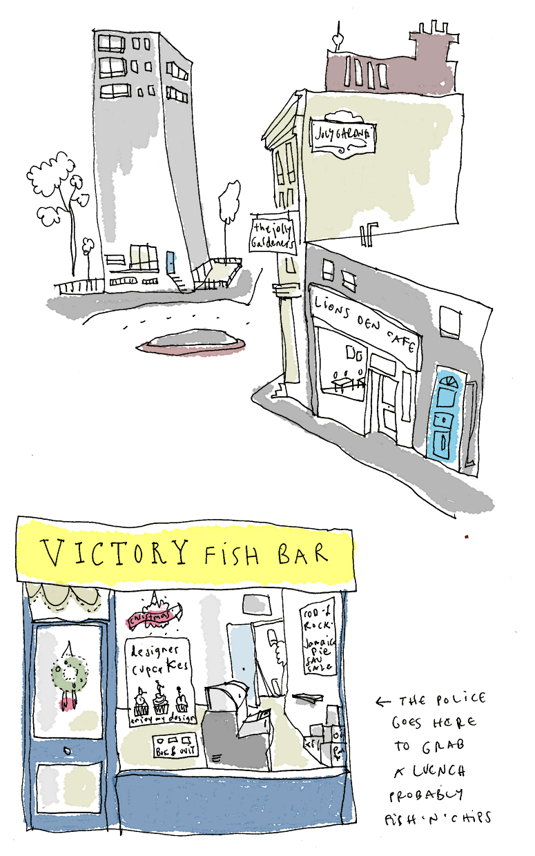 Drawings made while waiting for the bus next home. The Jolly Gardeners is an abandoned pub in a representative victorian building, and gives its name to the bus stop’s. There are some residential tower blocks, probably former affordable housing states. Typical food bussiness like fish’n’chips or fried chicken are spread along the road. South East London, 10 am.