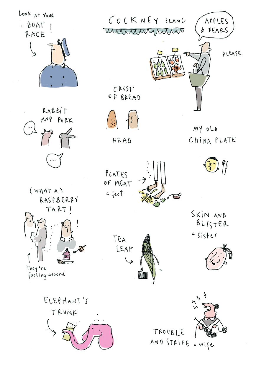 Cockney slang is a way of playing with words and with the foreginer. It is typical of the East London, and consists basically in changing the word (sister, look, thief, wife, stairs, mate, face…) for a couple of words that sound similar and rhyme with the omitted word (tea leaf, apples and pears, skin and blister, china plate…)