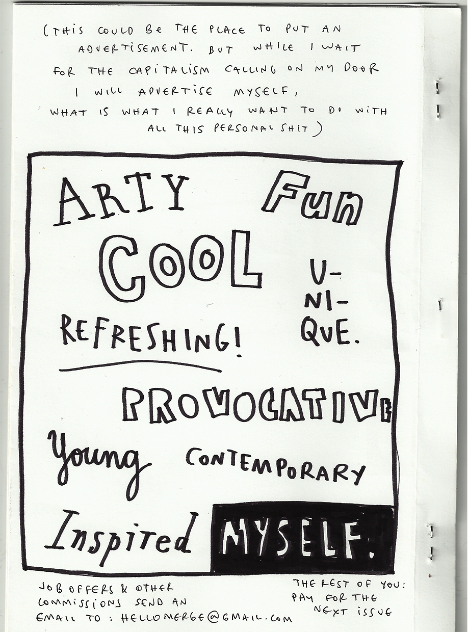 Personal Made Public zine merchesicoApril 20, 2012city, drawing, humour, illustration, language, other, zine Post navigation PreviousNext This is the last experiment made for a group crit around the “Personal Made Public” concept. March 2012, Camberwell. Share this: Click to email a link to a friend (Opens in new window) Email Click to share on X (Opens in new window) X Click to share on Facebook (Opens in new window) Facebook Click to share on LinkedIn (Opens in new window) LinkedIn Click to share on Pinterest (Opens in new window) Pinterest Click to share on Tumblr (Opens in new window) Tumblr Like Loading...