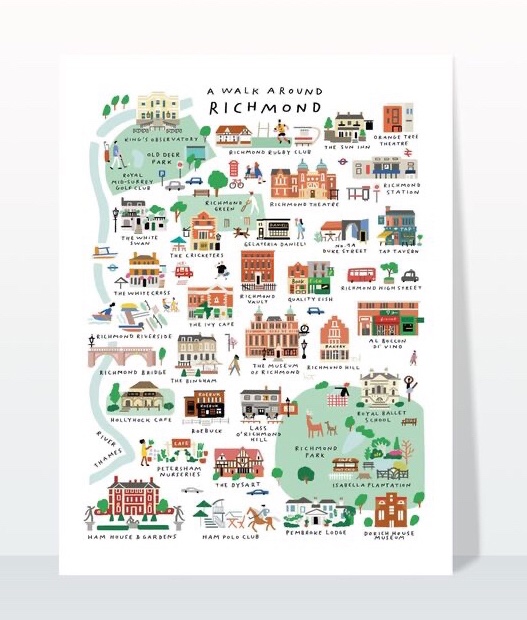 Map Illustration and hand lettering of Richmond’s popular landmarks and places (2021) Walk Around Richmond glicee print (30x40cm without the frame) From Place in Print